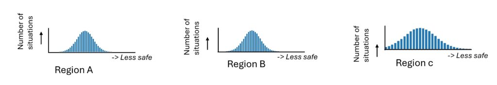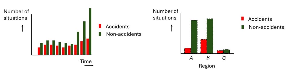Once data is gathered for all situations, then it is possible to analyse whether increases are caused by a change in exposure (‘more activity’) or in probability (‘higher chance of things going wrong’). It is then also possible to analyse which factors correspond with a higher probability of an accident. It is now possible to perform statistical analysis, so one can conclude whether a specific region indeed has a higher probability of an accident or any other (human) factor like a specific infrastruction location, the absence of a specific safety intervention or the moment in one’s shift.