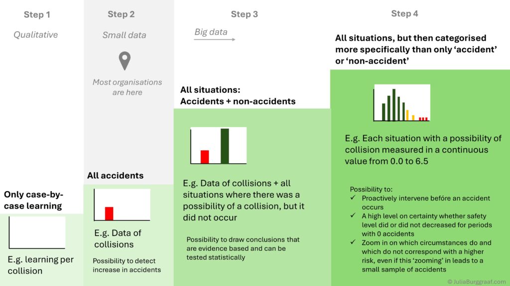 Step 4: The organisation records data for each accident ánd for each ‘non-accident’ like in step 3, but instead of measuring these binairy (‘accident’ or ‘non-accident’), it is measured in more categories. The smallest upgrade is to go to 3 categories like ‘accident’, ‘near miss’ and ‘non-accident’. The highest level is to measure the situation in a continuous numerical value. For example each red aspect approach can be measured in terms of maximum Deceleration to SPAD (mDtSPAD) in a required deceleration value (m/s).